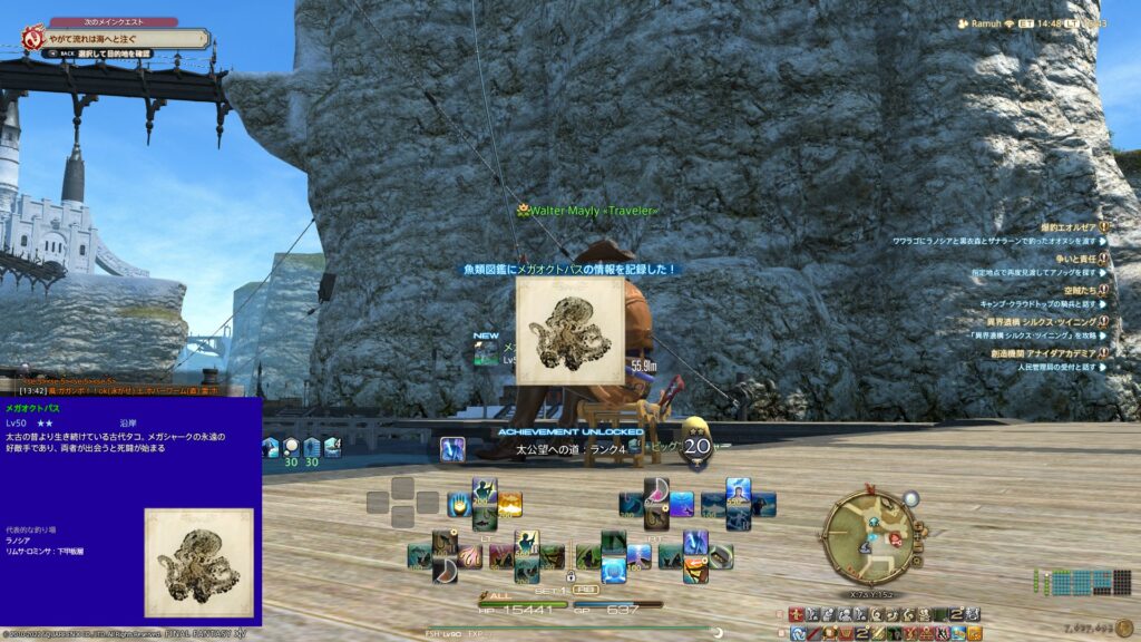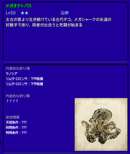 リムサ・ロミンサ:下甲板層:釣り場2023年3月30日 もくじ1. リムサ・ロミンサ:下甲板層🐟 リムサ・ロミンサ:下甲板層🐟 ヌシ:メガオクトパス 天候:特になし 時間:ET9:00-17:00 エサ:ピルバグ(泳がせ釣り) 釣り方:ピルバグでハーバーヘリング(強震!!)を釣り、泳がせ釣りをして激震(!!!)を待つ ふたりめでのひとこと タコとサメの死闘 図鑑 太古の昔より生き続けている古代タコ。メガシャークの永遠の好敵手であり、両者が出会うと死闘が始まる https://twitter.com/walter_rdb_ff14/status/1575716294170578944?s=20 #2人目のBigFishの道,FF14Posted by うぉるちー
